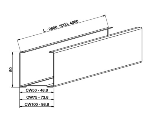 | PCW | Profil ścienny "C" występuje w długościach od 2,6 do 4,0 mb | 50 75 100 | 192 96 72 |